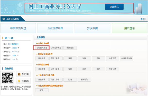 用户通过“网上工商业务服务大厅”,或者“网上工商业务服务大厅”下面的“名称业务—>名称预先核准”即可进入登录页面,如下图: