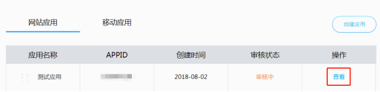 网站信息填写完成,点击“创建应用”后,网站应用创建完成,点击“应用管理”,进入管理中心,在管理中心可以查看到网站获取的appid和appkey,如下图所示: