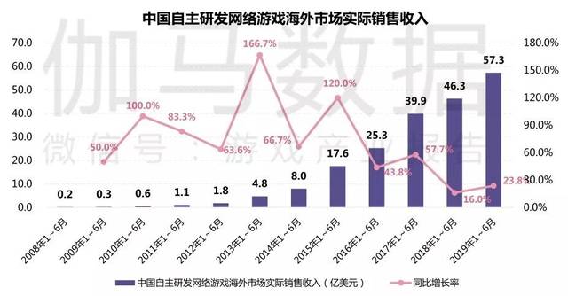 根据伽马数据显示,2019年上半年国产游戏出海增长同比有所突破,总销售收入为57.3亿美元,同比增长23.8%。