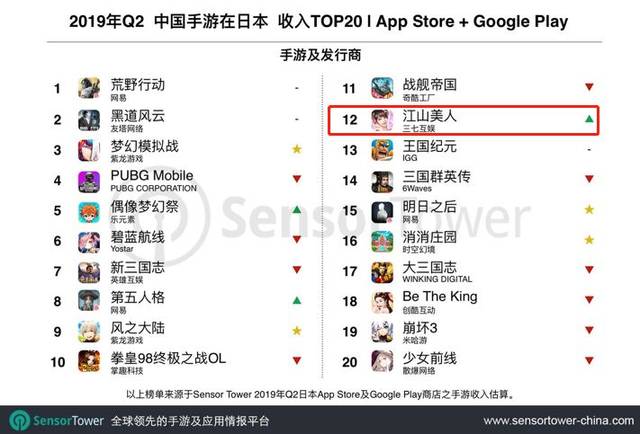 对于常见的国产手游全球化路线规划,在台港澳和东南亚立足后,目标更大的厂商将会把目光投向日韩和欧美第一梯队收入市场。从三七互娱2019年上半年在日本市场的表现看,他们加大了出海的步伐。据了解,上半年旗下卡牌游戏《SNKオールスター》于日本上线后迅速登上GooglePlay游戏下载榜榜首。同时代理发行的《江山美人》Q2在日本市场的收入排名上升至第12位。