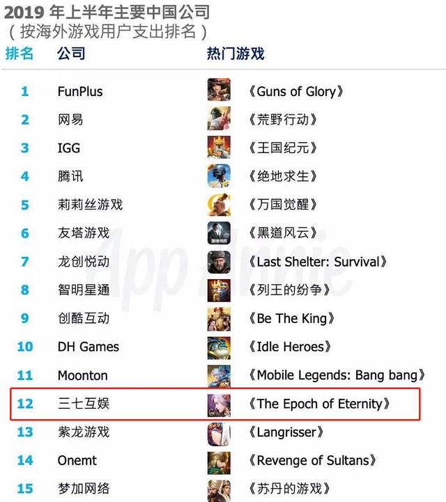 在今年上半年,三七互娱的全球化决心同样也带动了营收的增长,根据AppAnnie的统计,上半年三七互娱在出海发行商收入榜上排名第12位。除了新产品带来的收益,老牌产品《永恒纪元》在海外依然持续贡献着收入。