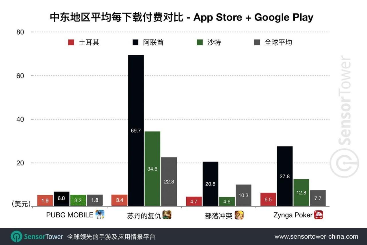 在区域市场之间,阿联酋RPD最高,沙特在多数品类中均高于土耳其(除了《部落冲突》)。但若与全球其它地区对比,阿联酋的RPD在各参照游戏中都远高于全球平均值。除了《部落冲突》,在其它参照游戏中,阿联酋的RPD是全球平均值的3倍以上,沙特的RPD亦高于全球平均值。土耳其的RPD则基本低于全球平均值,仅在《PUBG MOBILE》略微反超。