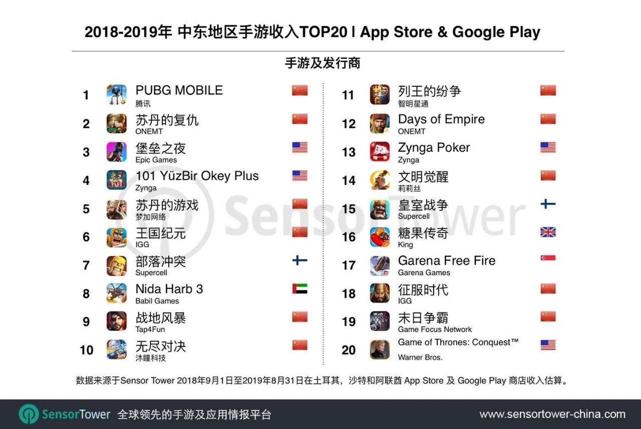 另外,在Top20榜单中,中国手游多达11款,占Top20总收入的69%。除了《苏丹的复仇》,其所属厂商ONEMT旗下还有一款《Days of Empire》也位列榜单之中,排名第12;此外,老牌出海厂商IGG的《王国世纪》、《征服时代》位于榜单第6和第18;梦加网络的《苏丹的游戏》、Tap4fun的《战地风暴》、沐瞳科技的《无尽对决》、智明星通的《列王的纷争》、莉莉丝的《文明觉醒》以及Game Focus Network的《末日争霸》分别位于第5、9、10、11、14、19。