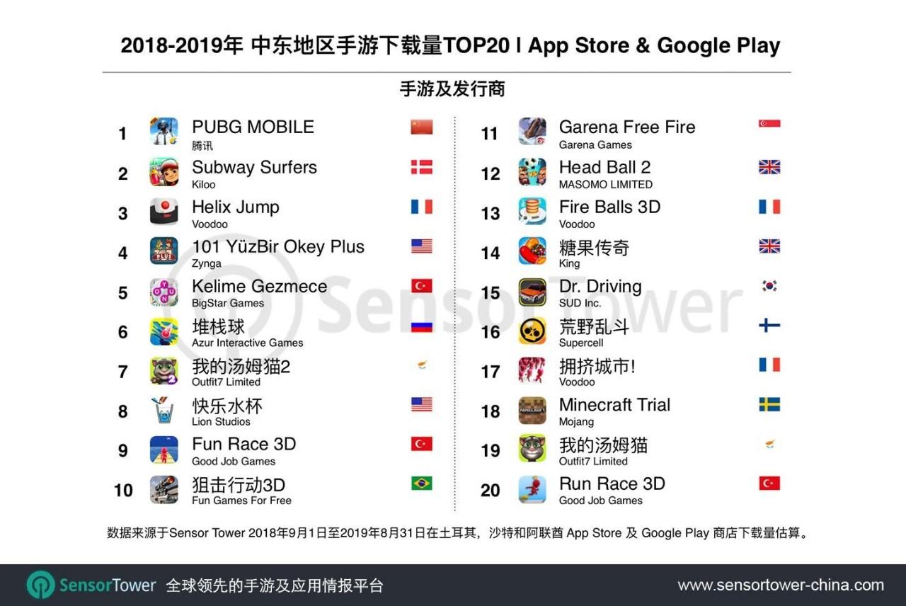 腾讯的《PUBG MOBILE》不仅登顶土耳其、沙特和阿联酋三个国家去年手游市场收入榜榜首,同时也位于这三个国家去年手游市场的下载榜榜首,其2660万次下载数量是《Subway Surfers》下载量的2倍。不过从游戏数量方面来看,榜单中超休闲游戏占据绝对优势,《我的汤姆猫》系列共2款游戏入围,表明大量新游戏用户涌入,当地尚处于增量市场。