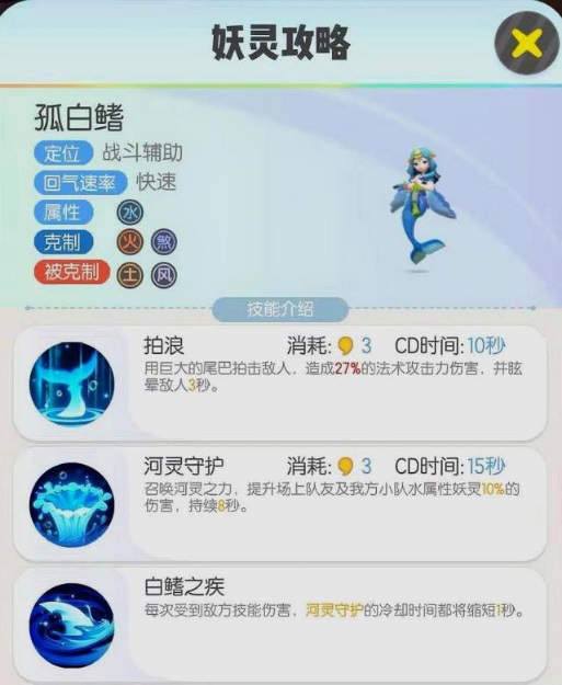 白秋练是一个水属性的辅助妖灵,又被玩家称为“白求练”,可以说是图鉴中的图鉴妖灵,自上线之后可以说几乎就没有登过场,堪称游戏中最惨的一个妖灵,虽说作为一个辅助妖灵,但是这个妖灵的辅助能力可以说是非常的差,一技能拍浪能够对敌人造成27%的法术伤害,并且眩晕敌人3秒的时间,虽说这个技能的伤害不高,但是有着稳定的控制效果,本来看似是一个不错的技能,奈何技能的CD却长达10秒的时间,也是瞬间就将这个技能的性价比给拉低了。二技能河灵守护则是能够提升场上队友及我方水属性妖灵10%的伤害,持续时间为8秒,虽说这个技能辅助的群体比较鸡肋,但是水属性目前各方面都是比较强的,所以说单纯辅助水属性的妖灵也是一个不错的选择,但是却又是活生生的被技能CD给害了。