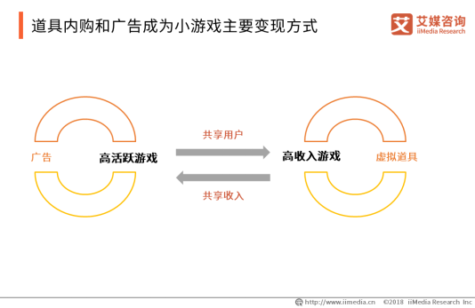 小游戏利用多样化平台的社交关系链拓展用户,如微信好友或群内PK、排行榜竞技、围观等,实现迅速、低成本的宣传,是行之有效的商业转化。目前小游戏的具体变现模式主要表现为道具内购和广告收入。