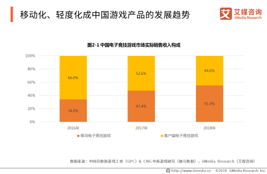 2018年中国电子竞技游戏市场实际销售收入达834.4亿元,同比增长14.2%。其中市场收入增长主要来源于移动电竞游戏收入的提升,移动电竞游戏的市场占比已经超过了端游,小程序游戏为代表的移动化、轻度化形式成为中国游戏产品的发展趋势。