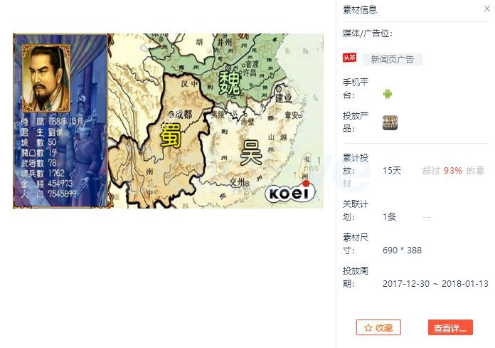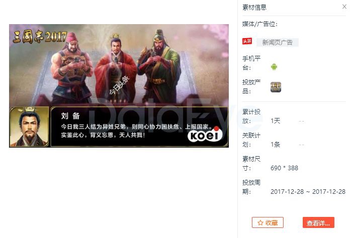 DataEye-ADX数据平台显示,2017年在投的三国游戏素材,以激烈战场及“赵云”、“诸葛亮”、“关羽”等游戏人物的图片介绍为主,网易、腾讯等大厂投放了少数视频素材。