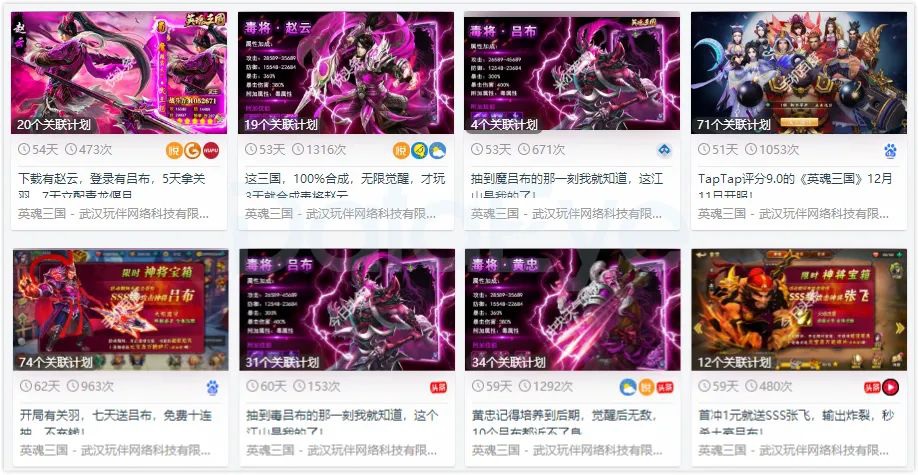 图片素材占比仍然较高,以《英魂三国》为例,三国题材游戏仍将投放的重点放在游戏角色上,大量包含“吕布”、“赵云”、“黄忠”、“张飞”等战将的图片素材,附上攻击值、防御值以及技能说明,通过激发男性玩家的英雄情结以及对谋略的兴趣,来获取用户。