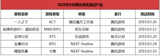 3月份,腾讯旗下有5款游戏测试,其中《一人之下》、《金属对决》与《螺旋风暴》为自研产品。