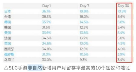 就SLG(Simulation Game模拟游戏)类型手游来看,非自然新增用户,月留存率最高的十个国家和地区排名依次为:日本、中国台湾、韩国、德国、英国、法国、西班牙、美国、乌克兰和俄罗斯。