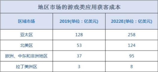 当然,大投入量也意味着获客成本增加。其中,亚太区手游用户的获客成本是全球最高,北美区排在第二,随后是欧洲、中东、非洲地区和拉丁美洲区。