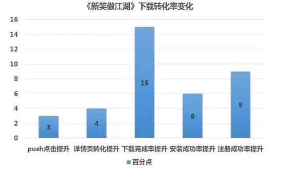 基于双方在A/Btest测试的共同努力,《新笑傲江湖》手游从开版预约到11月的计费删档测试中,Push带来的转化率有所提升,其中下载完成转化率提升15%,在科学、成熟、完善的方法论中也节省了素材更换的人力成本。