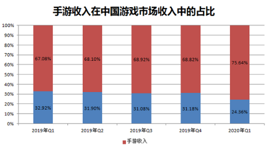另据报告统计,2020年Q1,中国移动游戏市场实际销售收入为553.7亿元,同比增长46.26%,占整体收入比例达到75.64%,移动游戏的市场份额进一步扩大。