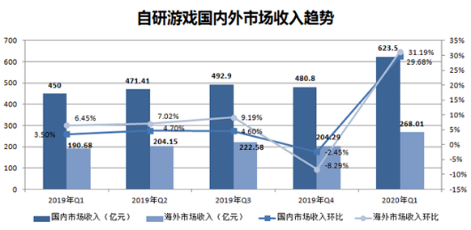 自研手游成为游戏精品化的主要推动力。据报告,2020年Q1,自主研发游戏国内市场实际销售收入达到623.5亿元,同比增长38.56%。