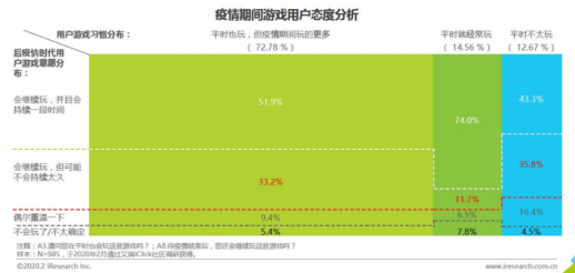 能否保证这部分用户永远留在“游戏圈”,不能仅靠游戏本身所展现的吸引力。上述数据也对玩家的游戏意愿进行了一定的展示,在“平时不太玩”的这部分用户中,会持续玩一段时间的占比为43.3%。言外之意,这部分用户是疫情期间被游戏厂商挖掘出来的深度用户,游戏在他们的心中已经成为了必备的休闲方式。另外还有35.8%的人表示会继续玩,但可能不会持续太久,此部分用户较比上部分更加不可控,对将此类用户掌握在手的厂商,可控的仅在于如何为他们提供进行游戏的动力,不可控的是游戏时间和日常生活的冲突程度。