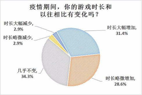在被问及疫情期间的游戏时长是否有变化时,调查显示有31.4%的受访者表示游戏时长大幅增加;28.6%表示时长略微增加;还有34.3%表示几乎不变;表示游戏时长大幅减少和略微减少的人均仅有2.9%。