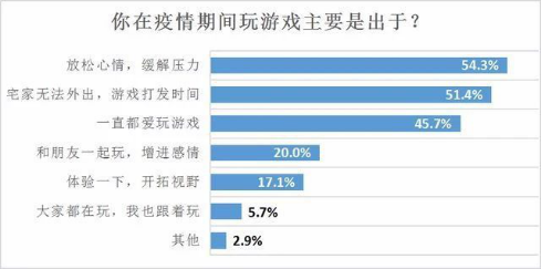 本次调查中,关于疫情期间玩游戏出于什么目的,借游戏放松心情、缓解压力和宅家无法外出,用游戏打发时间的占比都很高,前者为54.3%,后者则是51.4%。看得出很多人进行游戏颇有一丝被迫的意味,不过也有45.7%的人表示一直都爱玩游戏。