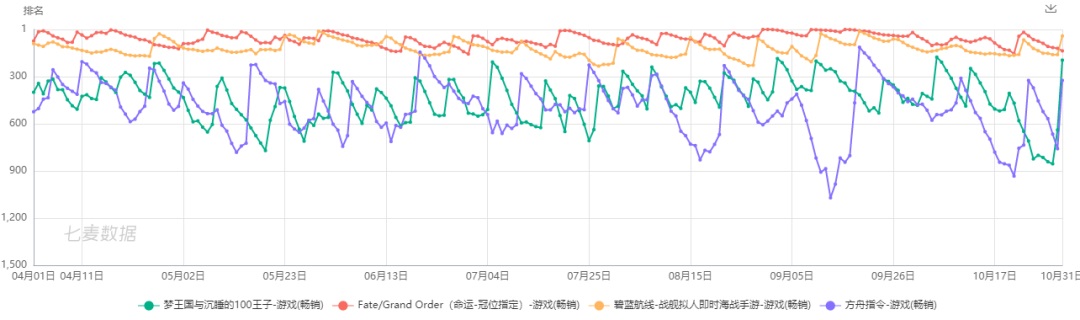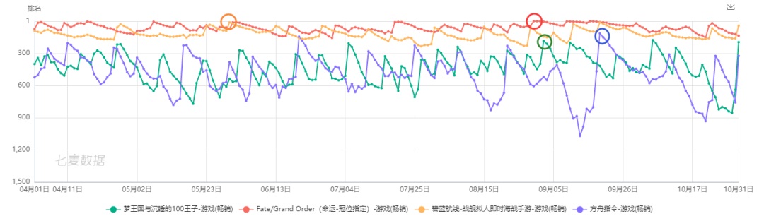 挑选成绩、受众范围、圈层属性都不同的几款产品,《FGO》《碧蓝航线》《方舟指令》《梦100》《BanG Dream!》,对比上线较早的前四款产品成绩走势,我们很容易能得出规律:典型二次元游戏,都是周期性冲榜的产品。