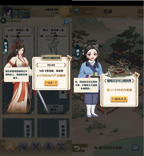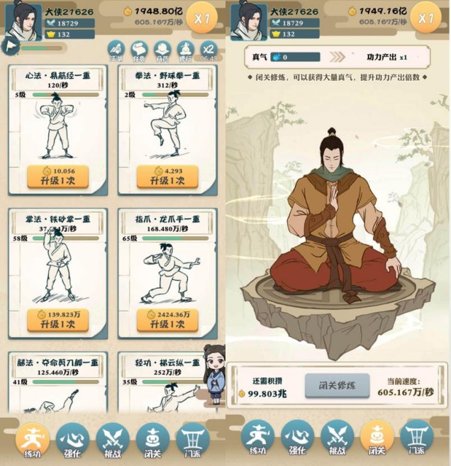 《我也是大侠》主打“不肝不氪”的放置玩法,主要靠挂机来获得“功力”值的增长。达到一定的“功力”值后,玩家就能解开秘籍习得武功,并依靠它提升武功等级,武功等级上升后,也会一定程度地增加“功力”值的产出。当然,玩家还能通过闭关的方式获得“功力”。同时,游戏也同样具有离线自动挂机的功能,玩家每次回到游戏都能收获一定收益。