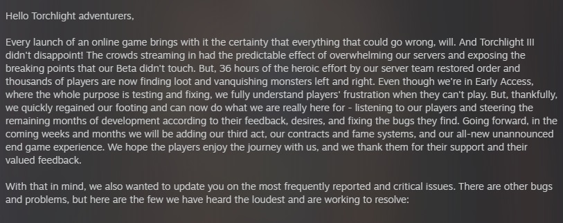 他们看起来对这一切有所准备,也理解一些玩家的失望,毕竟Early Access就是用来解决问题的。接下来的一段时间Echtra计划陆续上线第三幕内容、声望系统和更多的后期内容。在公告中,他们看起来很乐观——“这会是一场长期的战斗”("This?is an ongoing battle.")