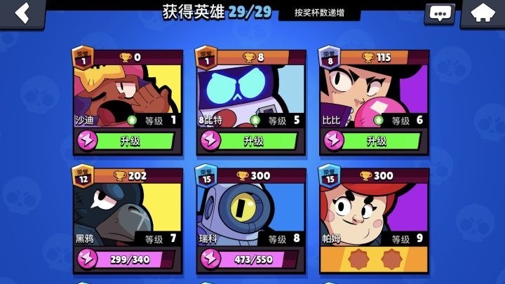 每个竞技游戏都会有计算段位的等级,《荒野乱斗》里用的是跟《皇室战争》里一样的杯数:比赛胜利就加杯,失败就降杯,英雄等级越高降得越多。特别的一点在于,玩家拥有的每个英雄都会单独计算杯数,玩家的总杯数就等于所有英雄杯数的总和。