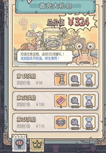 界面表现:324和634元礼包奖励内容和图案相符,图案设计堆叠多个宝箱道具,价值感十足。美中不足的是,充值首页图案却为奖励中没有的大脑器官道具,毫无无关联性。