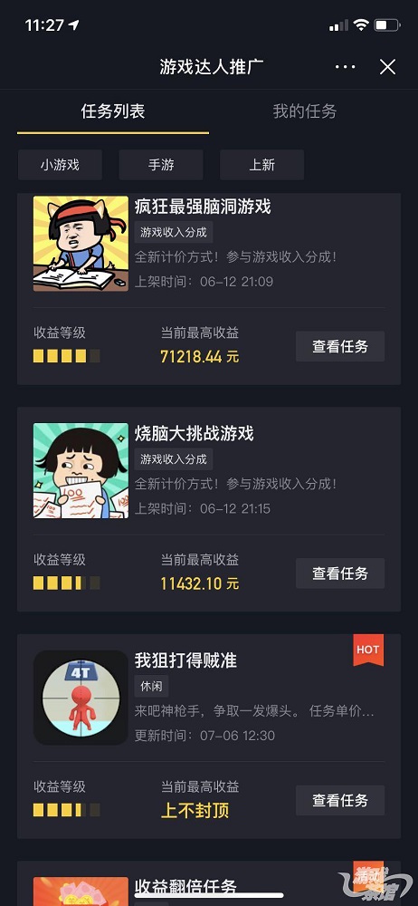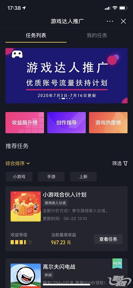 茶馆了解到,抖音开放了“游戏达人推广”小程序作为MCN接单入口,目前iOS和安卓版本抖音都可以进入,安卓可以进行游戏试玩,iOS暂时只能发布推广视频。该小程序定期会上线扶持计划、征集比赛等活动,参与达人买量的小游戏产品在主页面会被展示,按照分成方式不同,收益等级进行区分,抖音上的MCN可以自由接取任务,按照规则获得收益。