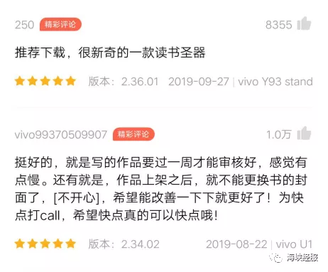 不过,即使是在高手如云的当下,快点App依旧凭借差异化的互动小说内容生态打造完成了突围。从创作端来说,快点与橙光、腾讯这类大厂相比,快点中的小说文学创作门槛更加低、加上表情包,颜文字的创新表达,使得小说创作模式和过去长篇网文的创作很不相同,也正因如此,用户对于快手App的未来也是十分看好,“读书圣器”、“相当给力”等标签更是成为软件的代名词。