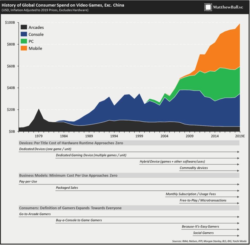 但是,在可预见的将来,传统上定义的游戏市场的总增长不太可能很大。在过去的几十年中,随着平台的不断变化,游戏人群的数量不断增长是由于(1)硬件运行时间成本的持续下降;(2)减少游戏时间成本;(3)增加休闲游戏的数量和多样性。