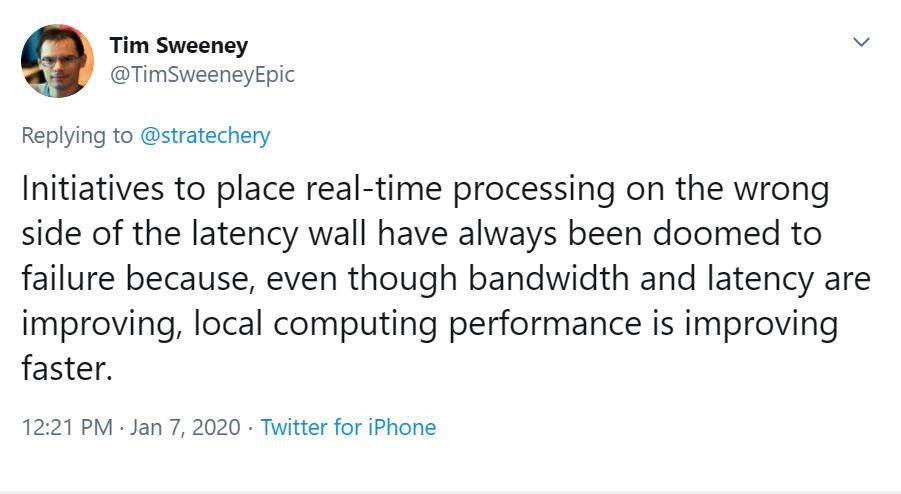 为此,我们可以参考Epic Games的创始人兼首席执行官Tim Sweeney的看法。他认为,尽管互联网的可靠性、速度和容量正在提高,但本地处理能力正在以更快的速度提高。结果,“将实时处理交给延迟一侧的计划(持续存在)注定会失败。”