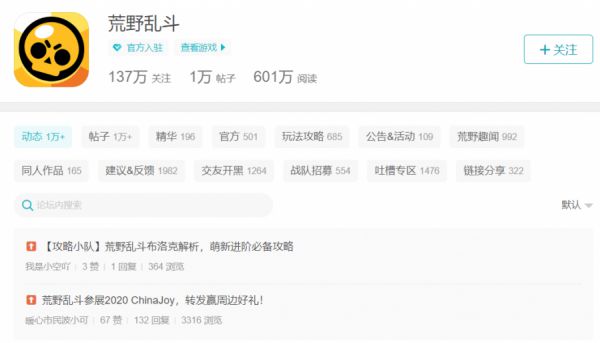 打开《荒野乱斗》官网,B站、微博、TapTap等社交平台或游戏论坛被放在足够显眼的位置,并且都进行了不同程度的话题以及粉丝运营。其中B站上有着视频征集活动,微博从未断过日常运营,TapTap游戏社区也有官方入驻,并且积累了137万的关注者。