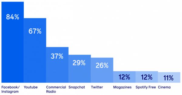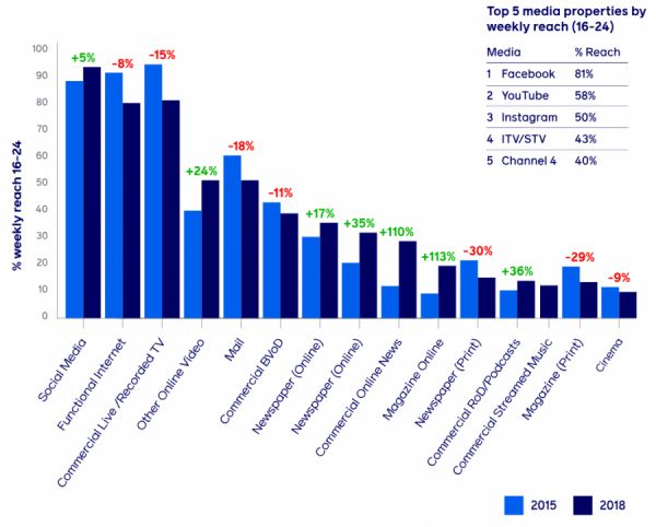 数据:IPA TouchPoints 2018 年数据,各商业媒体渠道在 16-34 岁英国受访者人群中的每周覆盖量(按可购买的媒体类型细分)。