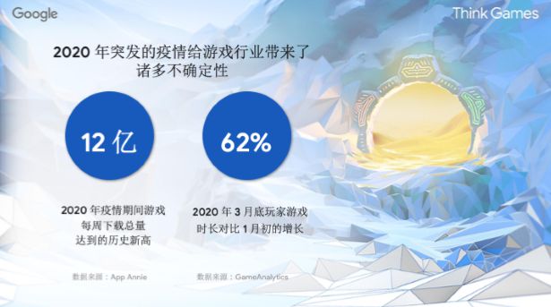 根据Newzoo预测,2020年全球移动游戏市场规模将达到772亿美元。与去年10%的年增长相比,由于疫情期间玩家数量和使用时长的增加,今年的年增速预估会达到13%。据App Annie的数据显示,在2020年疫情期间,游戏每周下载总量达到12亿次 ,创历史新高,而Game Analytics的数据指出3月底玩家游戏时长相较年初也有着62%的增长。