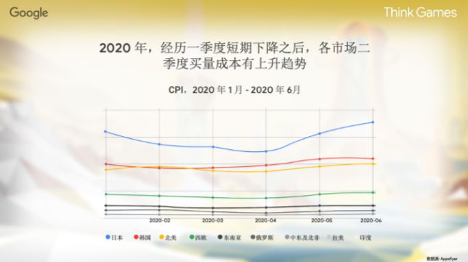 与此同时,买量成本也在持续上涨。AppsFlyer数据显示,2020年,经历一季度短期下降之后,各市场二季度买量成本有上升趋势。其中,日本市场的CPI涨幅最大。