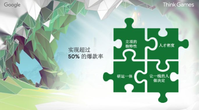 通过这些成功产品,钟英武总结出四个大的成功经验。首先是立项的独特性。立项的过程是不断迭代的,最重要的就是要找到立项本身的内核,也就是独特性,以及核心团队能否将这一独特性坚持下去并探索更多可能。其次是人才密度,趣加游戏针对项目的特性,会尽可能找到最合适的人才组建团队。再者是研运一体,从立项开始,即让研发和运营部门参与进来,互相合作,为做出更能打动玩家、以及真正弥补玩家需求的游戏而共同努力。最后则是“让一线的人做决定”,研发过程中碰到的困难,趣加游戏会将决定权交由研发一线人员。