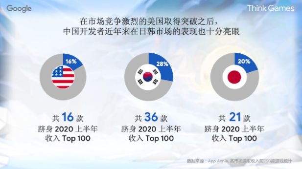 前面提到,上半年中国手游出海收入年增长达到37%,收入超55亿美元。Google谷歌中国大客户部游戏行业副总裁邓辉表示 ,中国手游开发者重要的增长来源之一便是全球游戏市场的拓展,近两年最大的进步来源于中国手游开发者在日韩市场的突破。瞄准成熟的海外游戏市场,成为中国游戏厂商出海的新趋势。