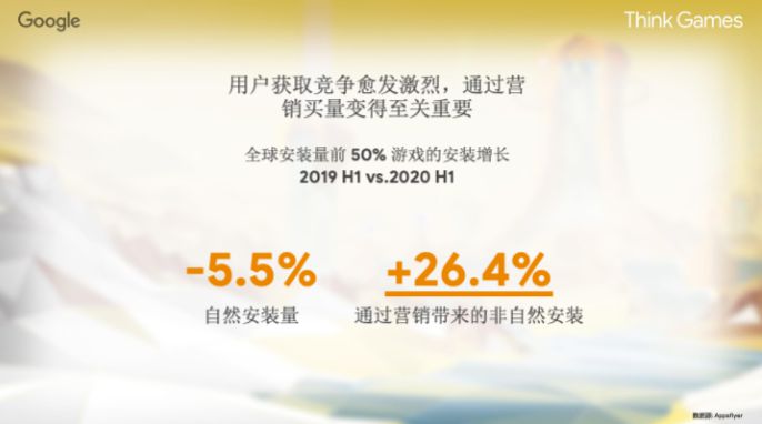 首先还是来看数据情况。Google谷歌游戏与应用行业战略洞察总监朱子浩和Google谷歌大中华区市场研究经理张沄玮,在会上解读了由Google谷歌、App Annie及AppsFlyer联合发布的《2020 移动游戏出海驱动力报告》,他们指出,2020上半年与2019年上半年相比,游戏整体通过营销买量带来的非自然安装量增长了26.4%,而自然安装量则下降了5.5%。整体而言,游戏市场开始越来越重视通过广告渠道买量。