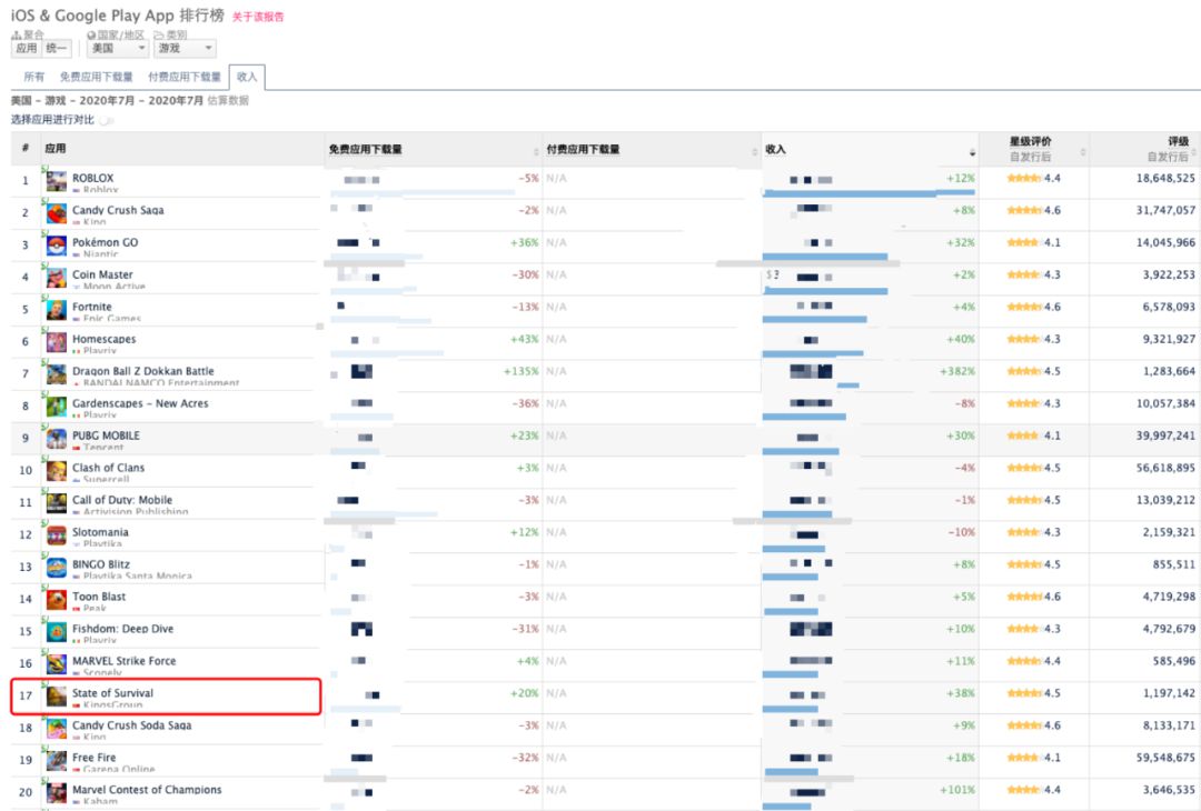 在AppAnnie 2020年7月美国游戏收入榜和下载榜单中,趣加游戏新游《State of Survival》在SLG品类中均位居第一。