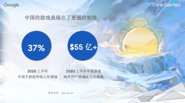 不过,在这样一个特殊的年份,Google谷歌中国大客户部游戏行业副总裁邓辉表示,中国的游戏公司和开发者表现出了更强的韧性。App Annie数据显示,跟全球手游大盘相比,中国手游在海外市场2020年上半年的收入年增长达到37%,收入规模超过55亿美元。