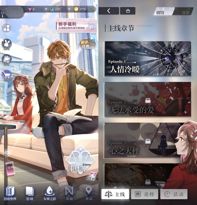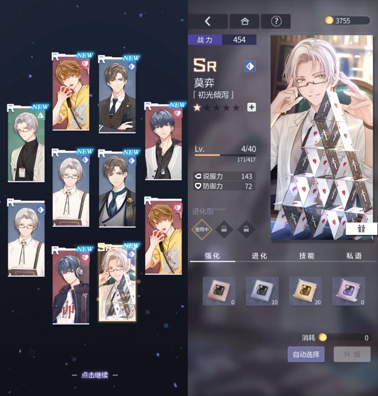 同样,卡牌的养成也被精简不少。一方面是卡牌稀有度只有R、SR、SSR三个级别,重点完全放在有动态卡面的角色卡上,另一方面,卡牌养成的条理也很清晰,不同男主角、属性、稀有度需要不同类别的素材,素材则主要从每日副本中获取。