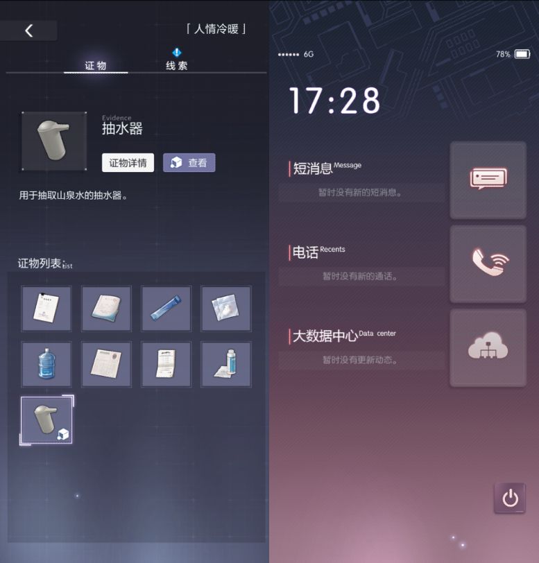 另外在收集证物、检视案件相关物证的这些环节,《未定事件簿》也采用了一些技术手段来提高表现力。如果仔细观察的话,可以发现收集物证的场景由3D环境搭建,这提供了很多交互上的细节效果,比如拉近距离观察物品细节的部分。