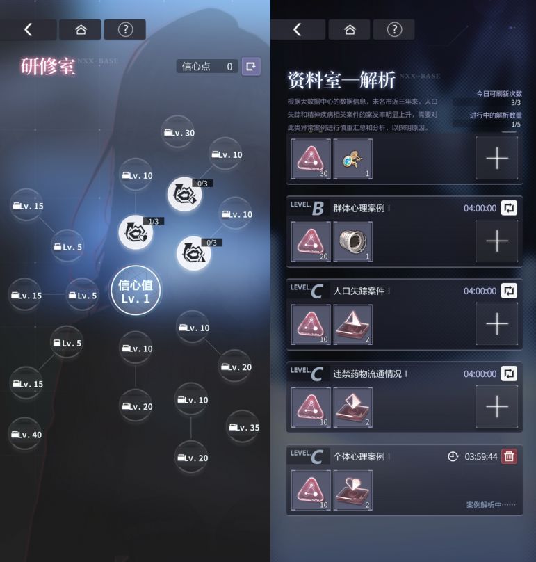 在游戏里你甚至能看到二次元领域非常常见的基建系统、远征系统(资源解析)。只不过《未定事件簿》的基建做的更简单直接,以资源解析的产出,来直接提升研修室的面板属性,并融入了一部分的技能分支树供玩家阶段性选择。