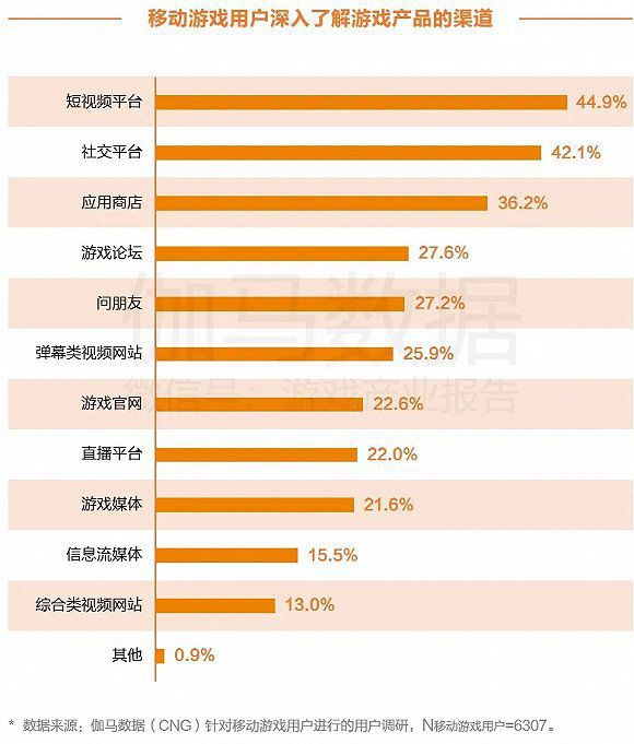 伽马数据用户调查数据显示,短视频平台是移动游戏用户深入了解一款游戏产品时选择倾向最高的渠道,占比为44.9%;其次是社交平台,占比为42.1%。