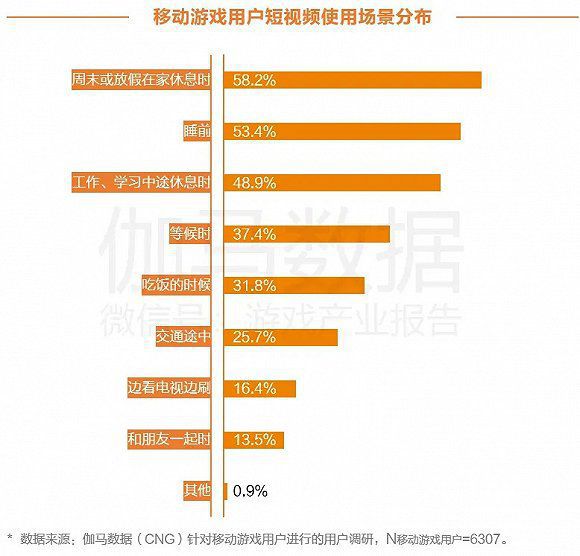 根据伽马数据对移动游戏用户进行的用户调查,在短视频的使用场景中,用户选择周末或放假在家休息时刷短视频的占比最高,达58.2%;选择在睡前刷短视频的用户占比53.4%;选择在工作、学习中途休息时刷短视频的用户占比48.9%。可见,放松休息时是用户使用短视频概率较高的场景。