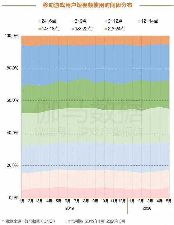 移动游戏用户中,在12~14点和18~22点间使用短视频的用户占比较高,表明用户倾向于在休息的时间段刷短视频来放松自己。
