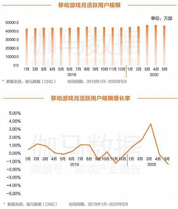 从移动游戏月活用户规模来看,2019年起移动游戏月活跃用户数量基本保持稳定,无明显增长。从增长率变化情况来看,由于疫情原因,2020年一季度用户规模增长较为明显,二季度开始明显下降。