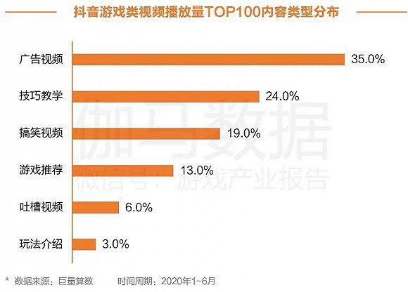 在如抖音等短视频平台的游戏类视频播放量TOP100中,数量占比最高的是广告类视频,占比35.0%;其次是游戏技巧教学类,占比24.0%;搞笑类视频占比19.0%,排在第三位。从其占比情况来看,广告类视频虽然占比最高,但与其他类型视频占比相差相对较小,表明短视频平台播放量较高的视频中,内容类型的差异较小,短视频平台的兼容性更高。