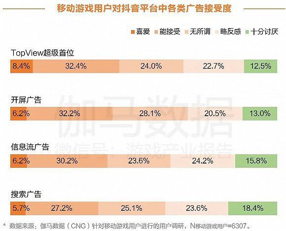 根据伽马数据对移动游戏用户进行的用户调查,用户对于“TopView超级首位”广告的接受度达到40.8%,占比最高;同时,对于该类型广告表示十分讨厌的用户占比最低,为12.5%。“TopView超级首位” 为抖音独创的广告形式,相较于其他短视频平台,抖音在广告形式方面具备竞争优势。