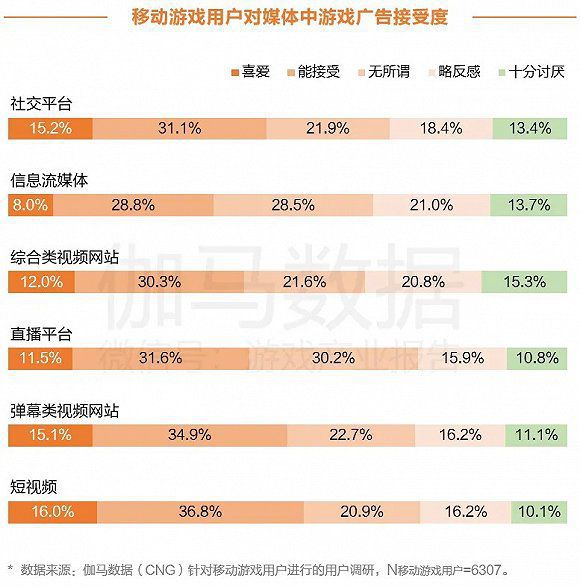 伽马数据用户调查显示,在各类媒体中,移动游戏用户对于短视频平台的广告接受程度最高。表示喜爱和能接受的用户合计占比超过五成,表示略反感和十分讨厌的用户合计占比26.3%,也较其他类型的媒体占比低。